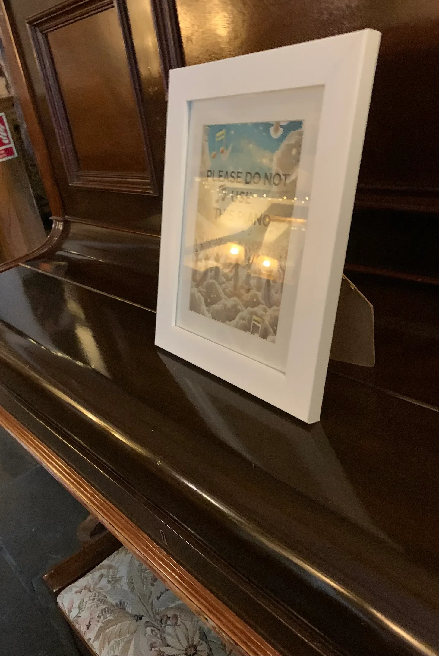 After half an hour or so, I found myself standing beside the piano, it's lid was closed, and on it was a framed picture with the words: